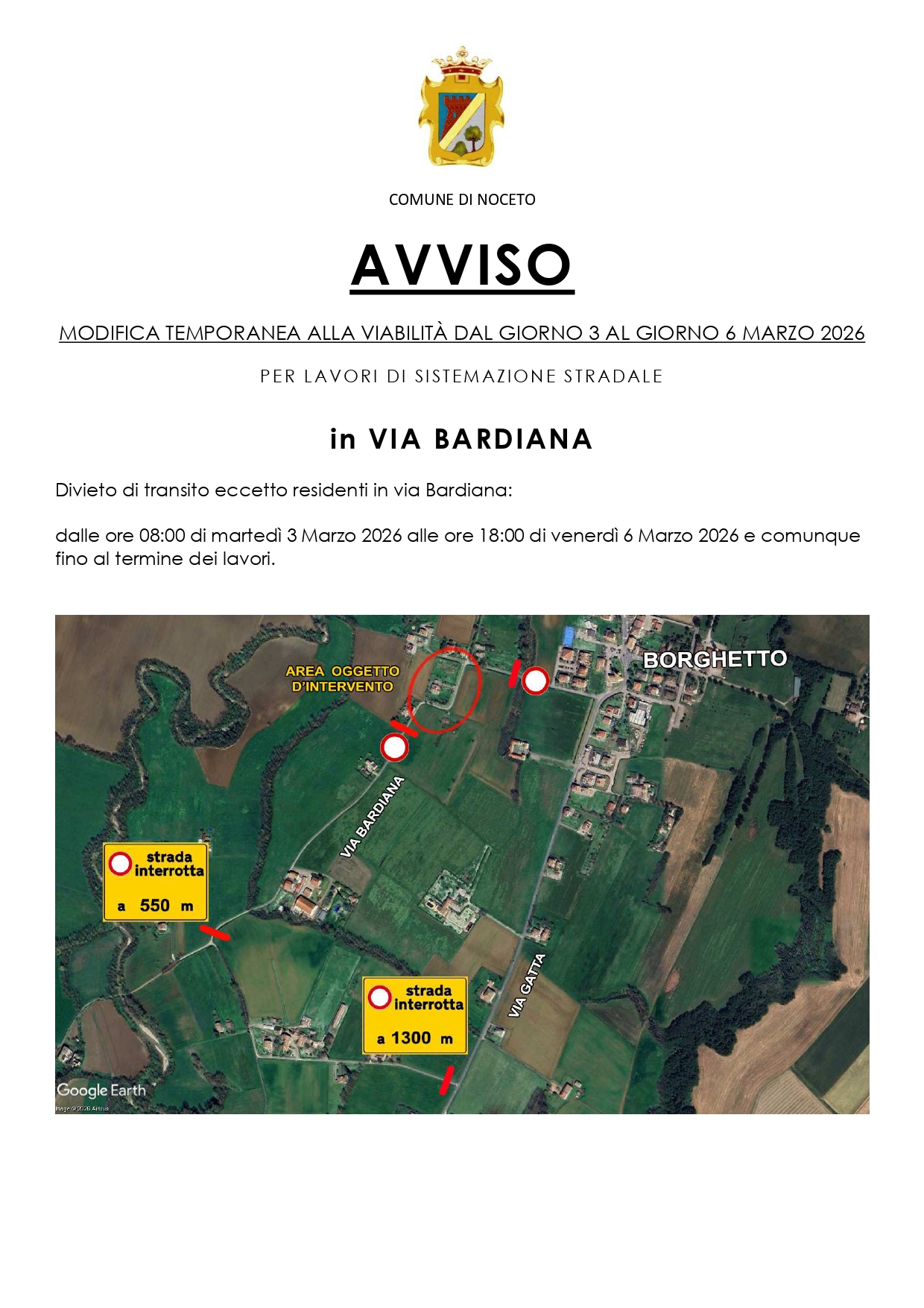 Modifica temporanea alla viabilità in via Bardiana dal giorno 3 al giorno 6 marzo per lavori di sistemazione stradale.