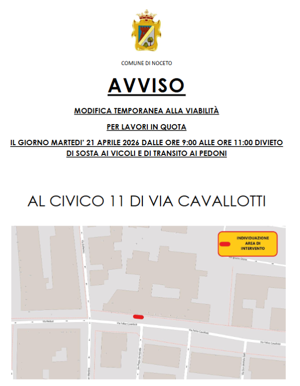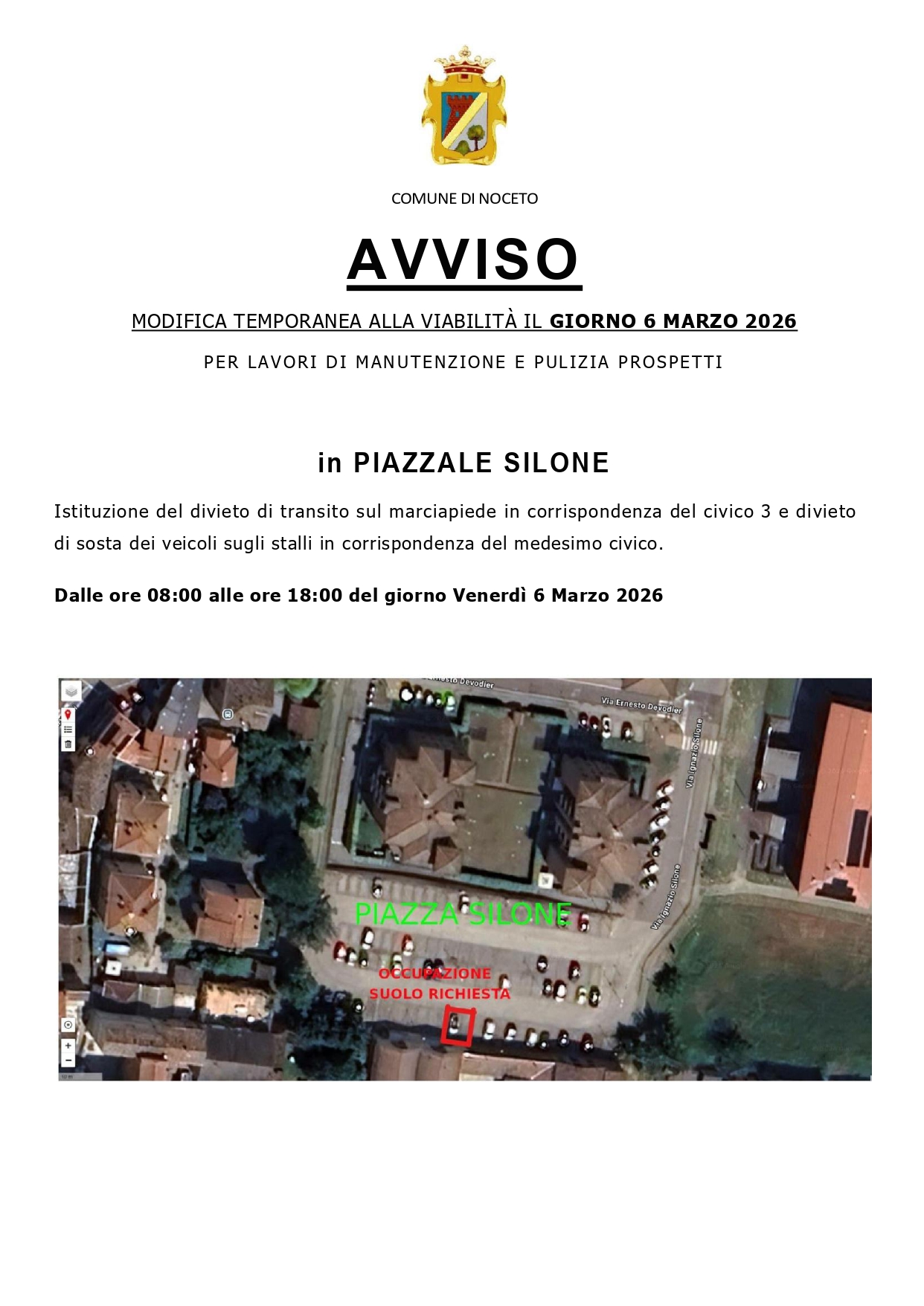 Piazzale Silone: venerdì 6 marzo, dalle ore 08:00 alle ore 18, modifica temporanea alla viabilità per lavori di manutenzione e pulizia prospetti. L'ordinanza è disponibile sul sito del Comune di Nocet...