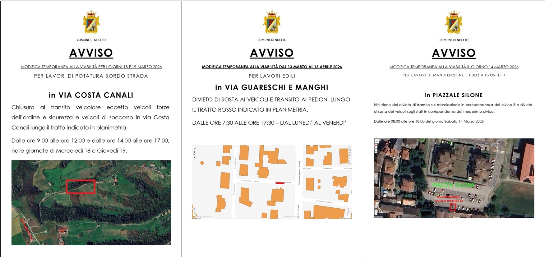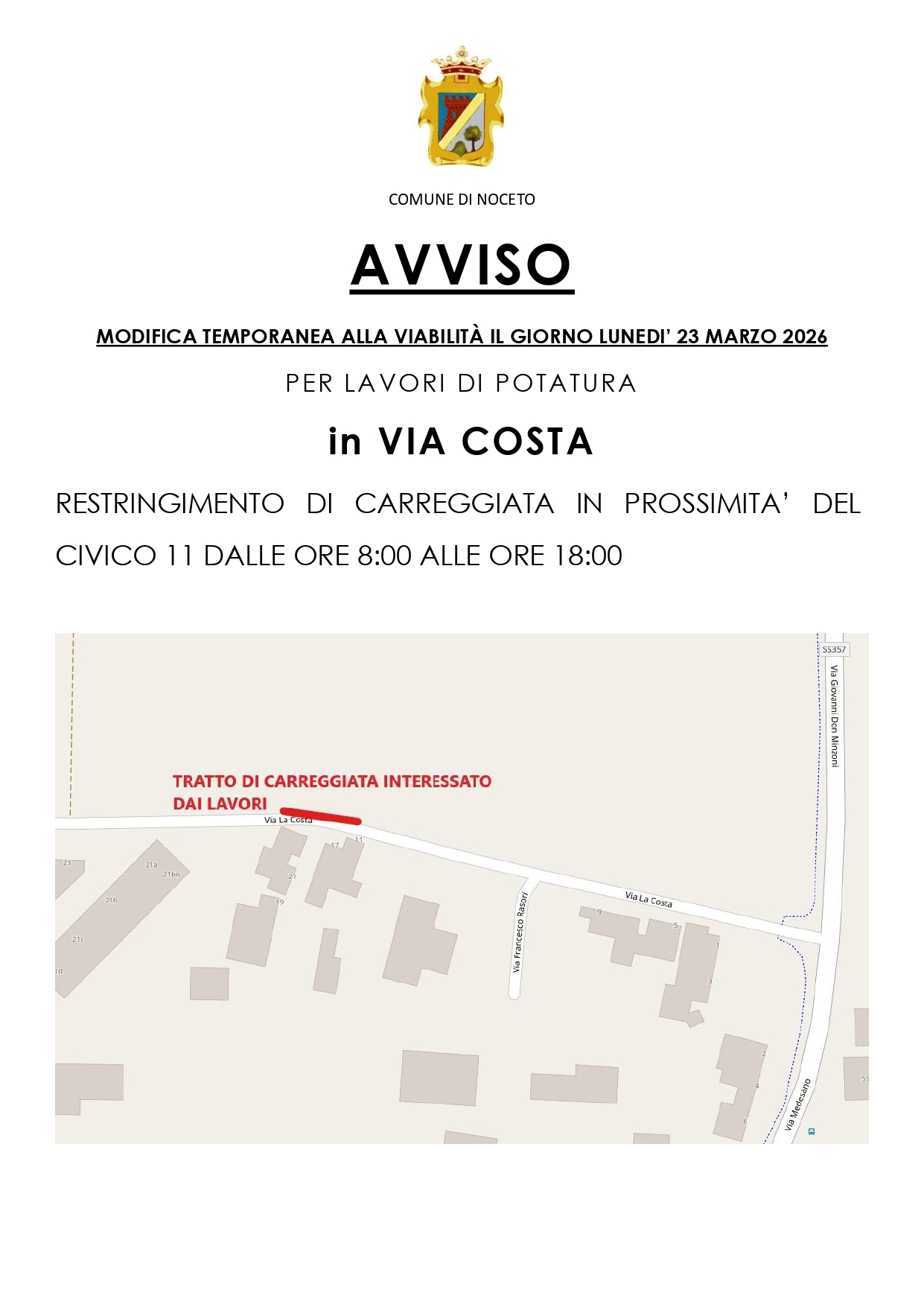 In VIA COSTA CANALI modifica temporanea alla viabilità nei giorni 18 e 19 marzo 2026 per lavori di potatura bordo ...