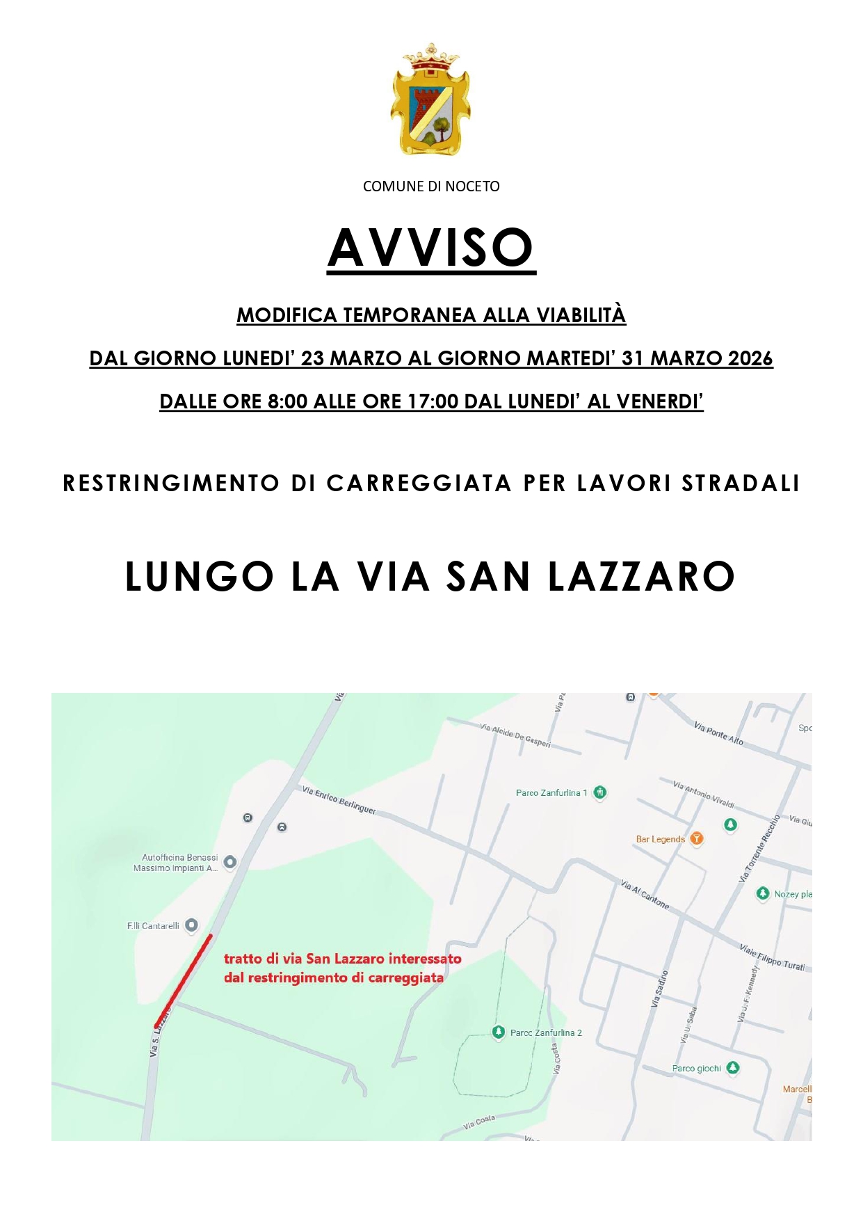 Via San Lazzaro: modifica temporanea alla viabilità da lunedì 23 marzo al 31 marzo dalle ore 8:00 alle ore 17:00 dal lunedì al venerdì per restringimento di carreggiata per lavori stradali.