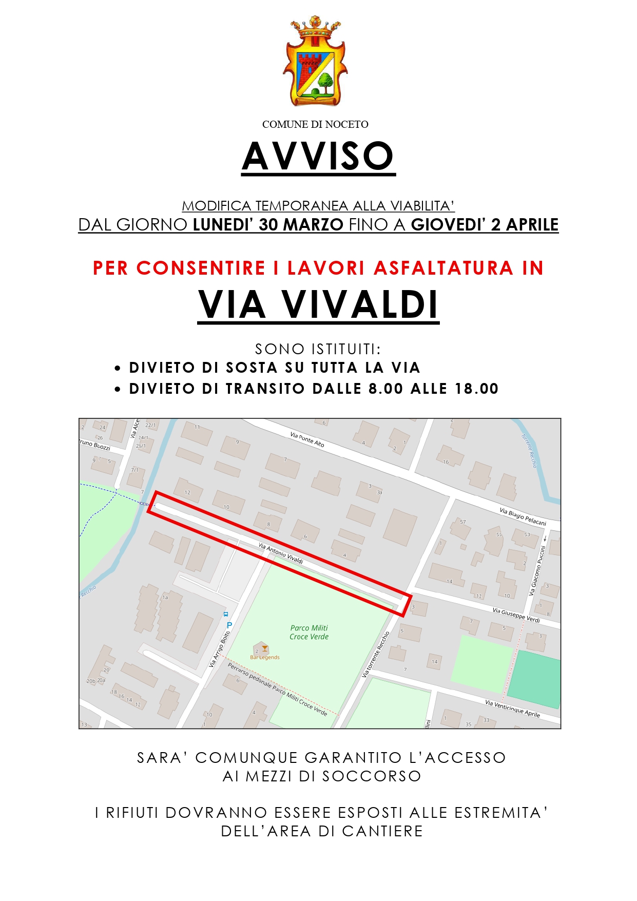 Via Vivaldi: modifica temporanea alla viabilità da lunedì 30 marzo fino a giovedì 2 aprile per lavori di asfaltatura. Divieto di sosta su tutta la via e divieto di transito dalle 8.00 alle 18.00. Sarà...