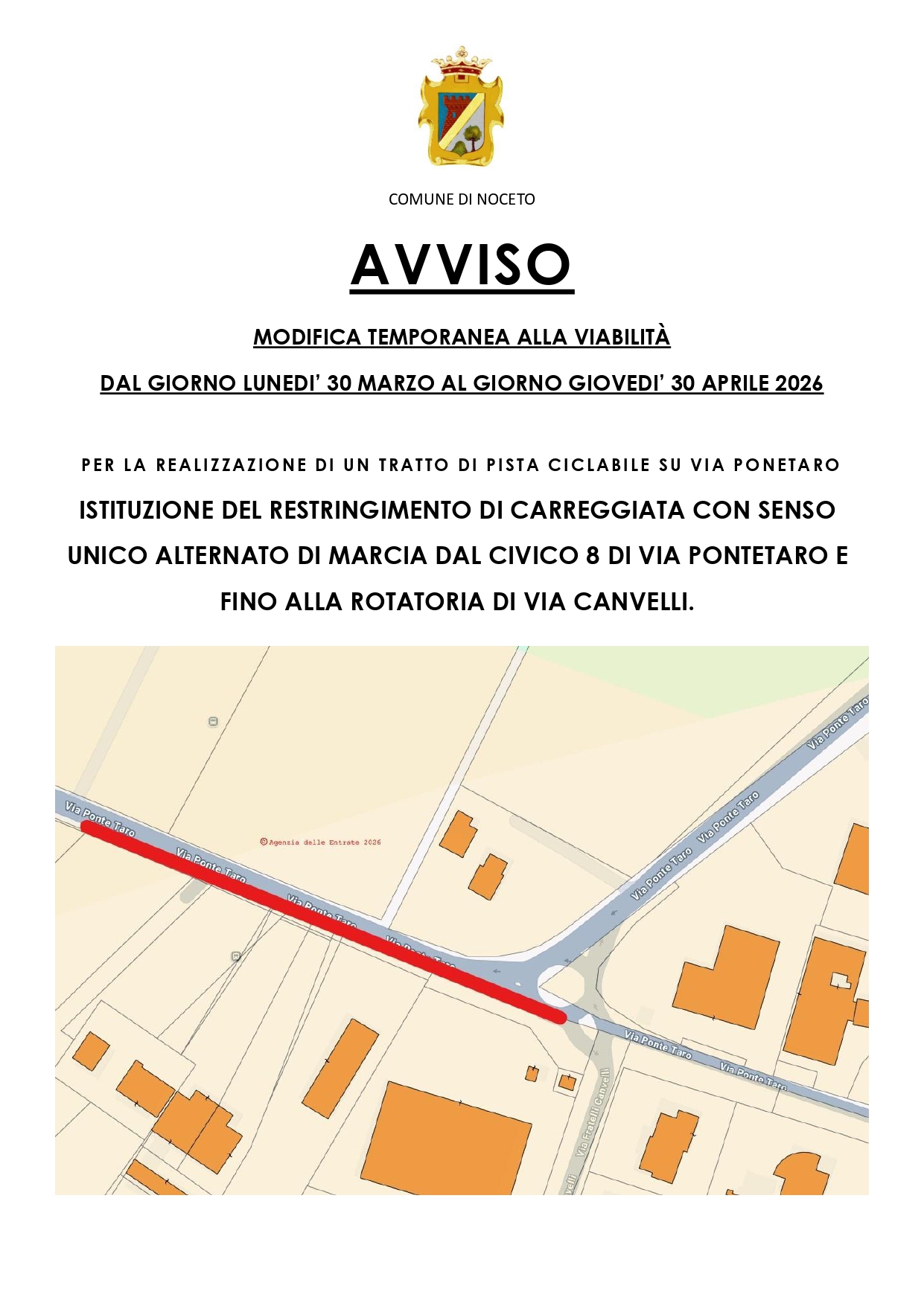 Modifica alla viabilità dal 30 marzo al 30 aprile Pista ciclabile su via Pontetaro per la realizzazione di un tratto di pista ciclabile. Istituzione del restringimento di carreggiata con senso unico a...