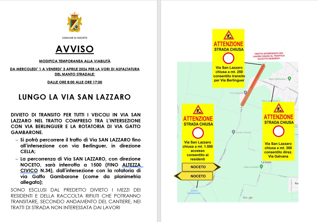 Modifica provvisoria della circolazione su via San Lazzaro da lunedì 13 al giorno venerdì 17 aprile 2026