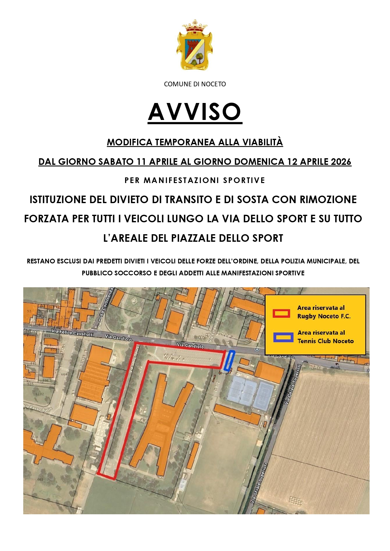 Sabato 11 e domenica 12 aprile, Torneo di minirugby Colla De Sensi e Torneo nazionale di tennis: modifiche alla viabilità in via e piazzale dello Sport
