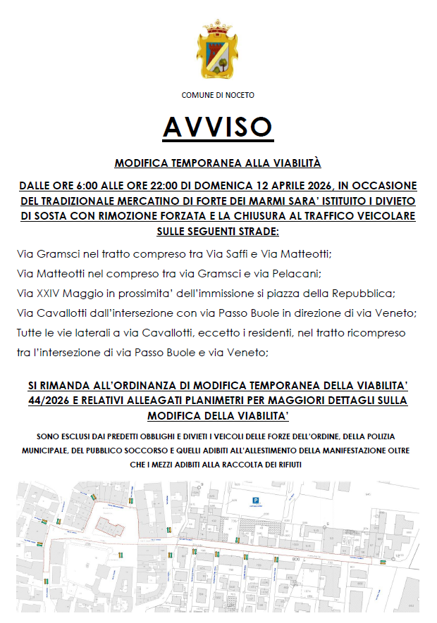 Dalle ore 6:00 alle ore 22:00 di domenica 12 aprile 2026, in occasione del tradizionale mercatino di Forte dei Marmi...