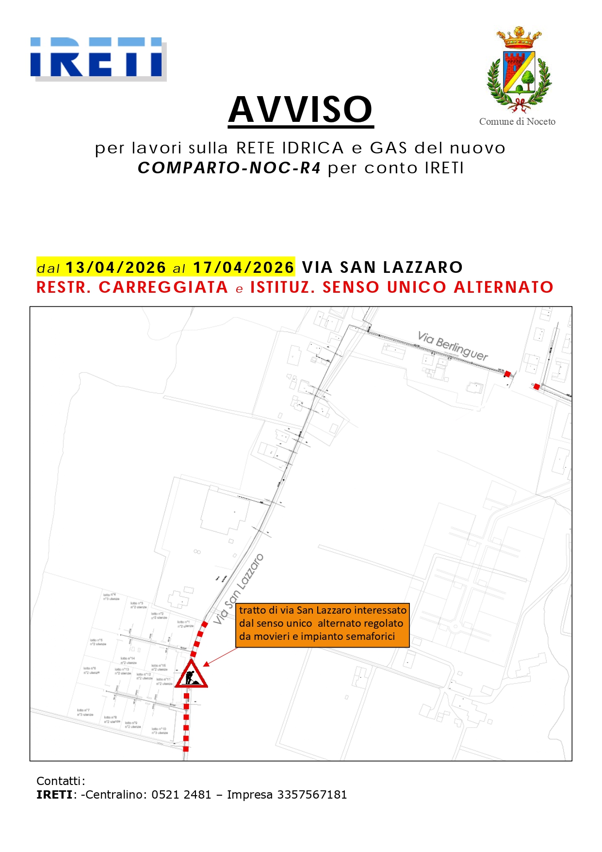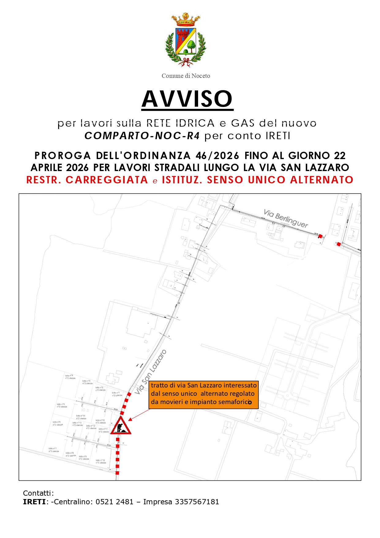 Proroga dell'ordinanza 46/2026 fino al giorno 22 aprile 2026 per lavori sulla rete idrica e gas del nuovo comparto-noc-r4 per conto IRETI lungo via San Lazzaro restringimento carreggiata e istituzione...