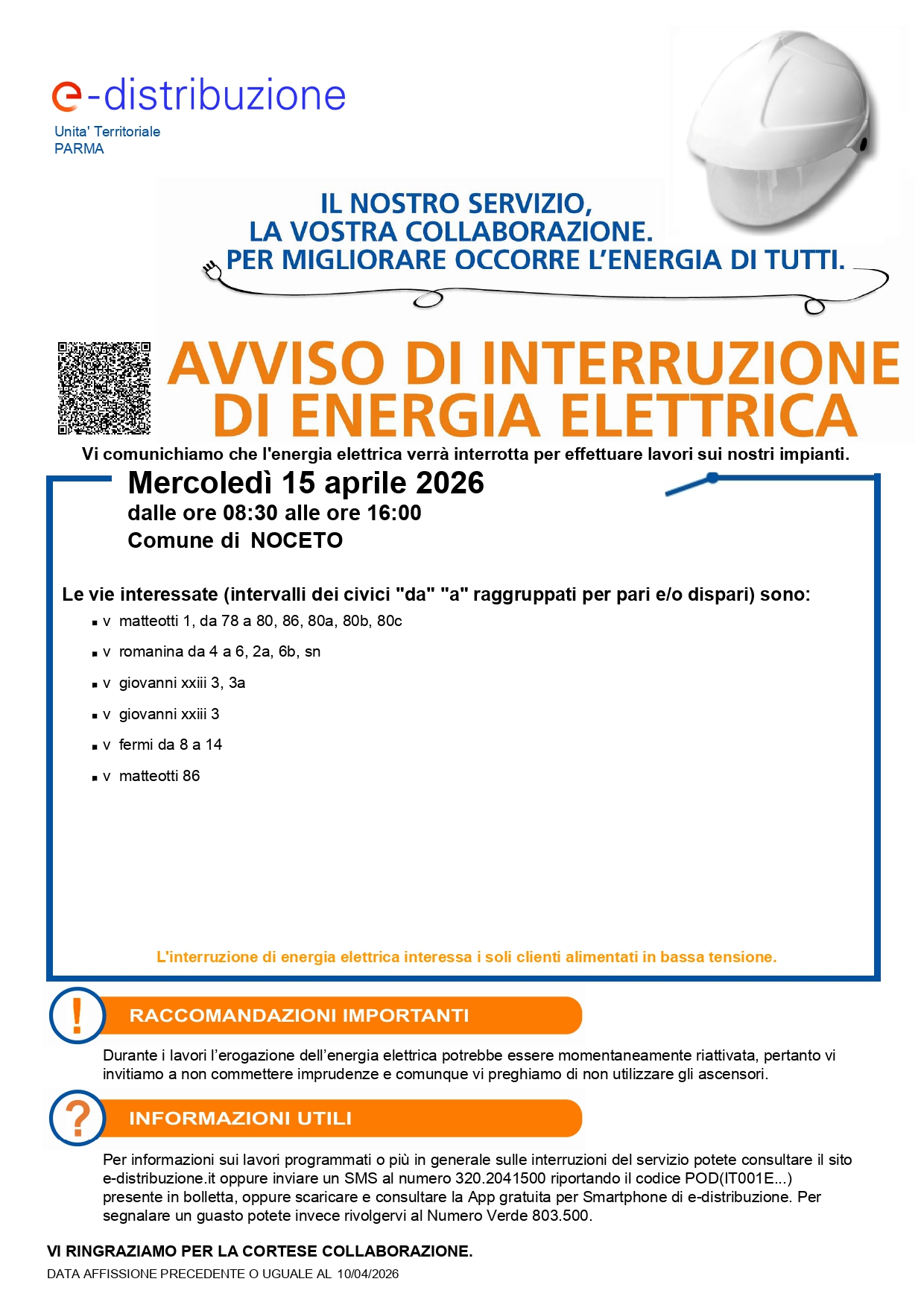 Si comunica che l'energia elettrica verrà interrotta, mercoledì 15 aprile dalle 08:30 alle 16:00, per lavori su impianti di e-Distribuzione.