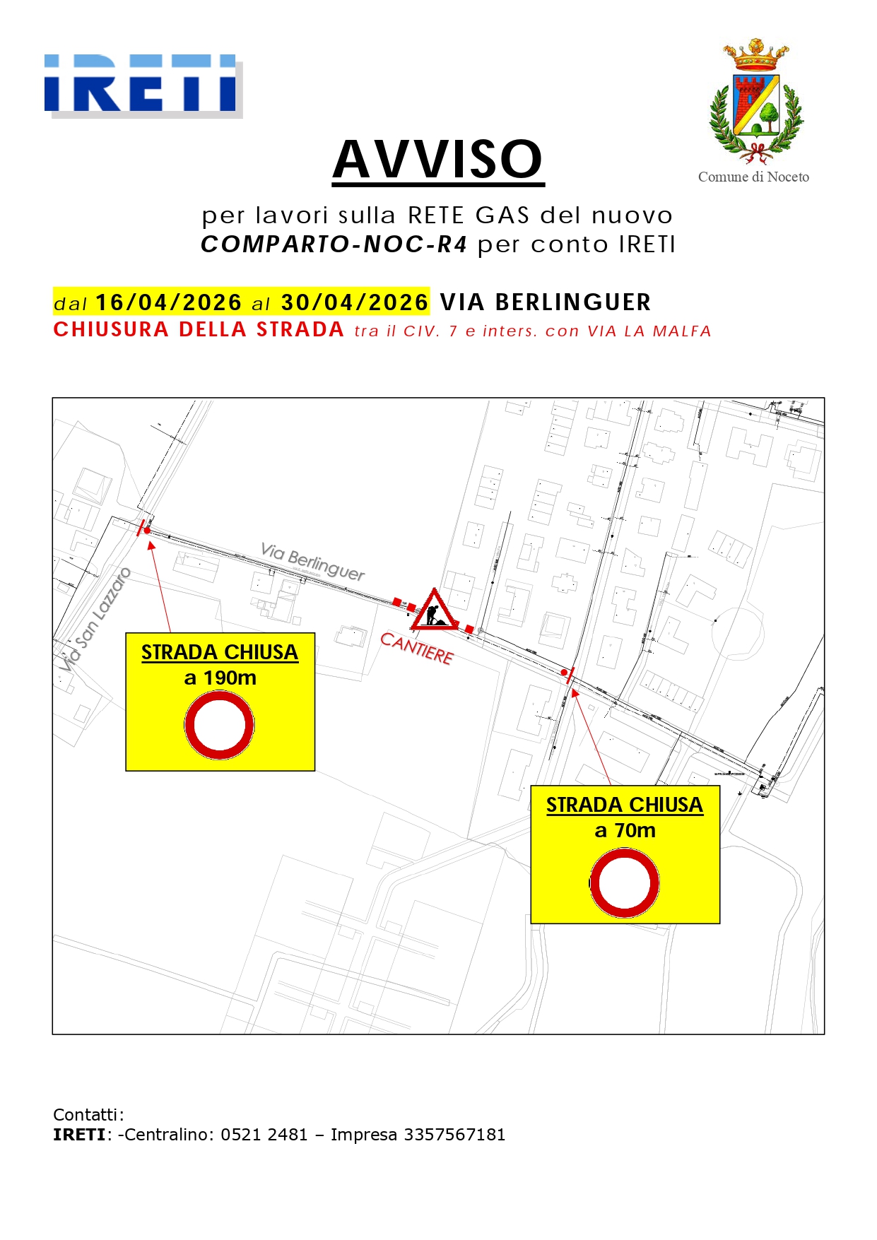Chiusura via Berlinguer, tra il civ. 7 e intersezione con via La Malfa, per lavori sulla rete gas del nuovo comparto-noc-r4 per co...