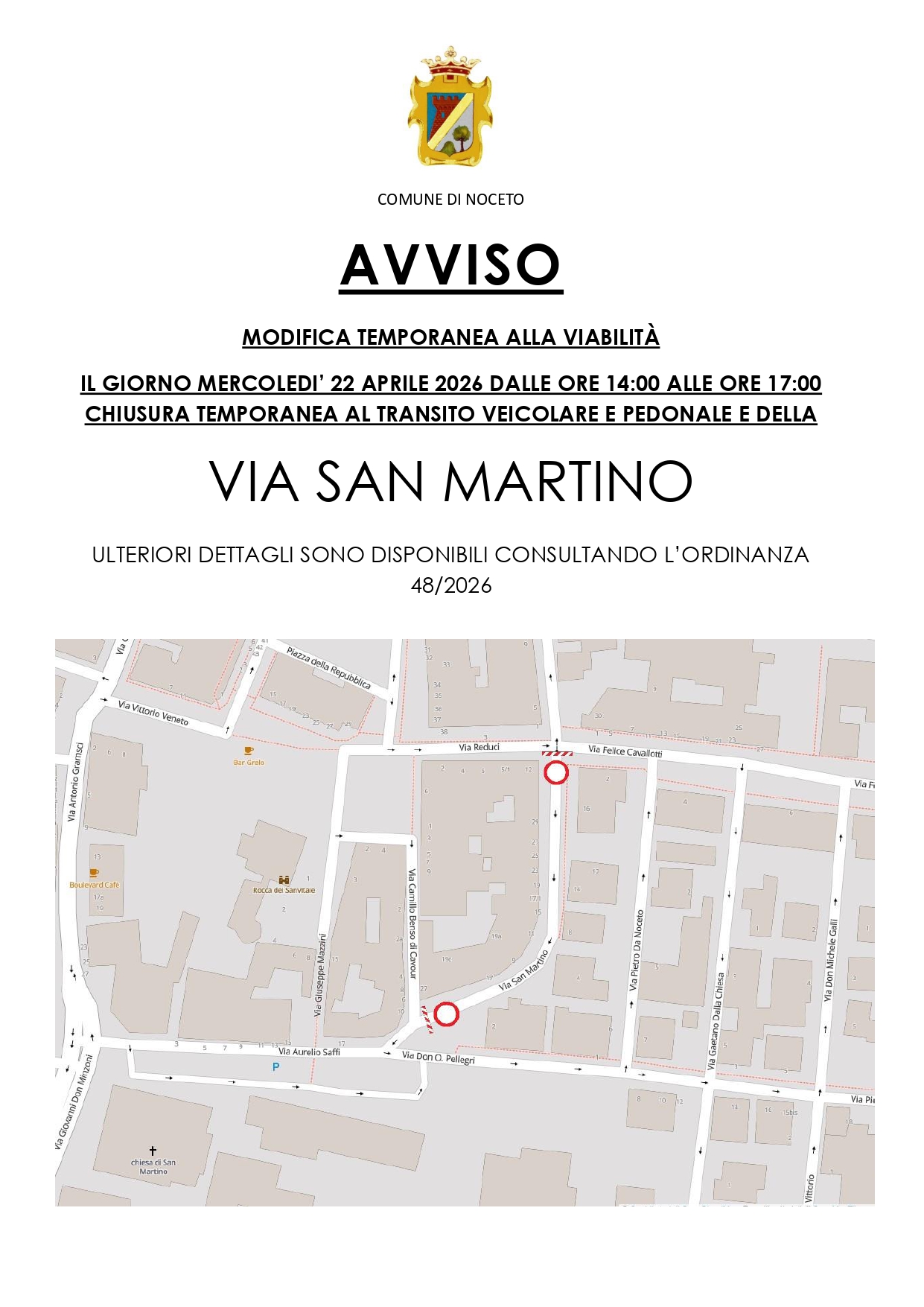 Mercoledì 22 aprile, dalle ore 14:00 alle ore 17:00, chiusura temporanea al transito veicolare e pedonale in via San Martino. Il Comu...