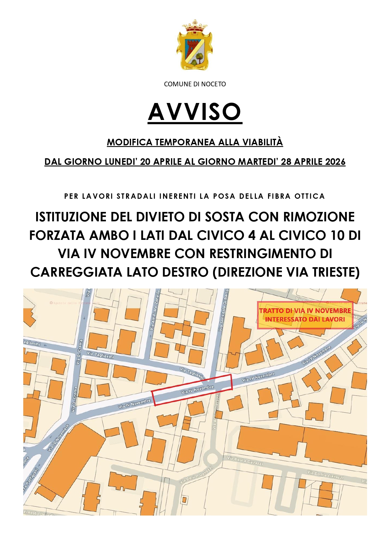 Via IV Novembre: modifica alla viabilità da lunedì 20 aprile a martedì 28 aprile