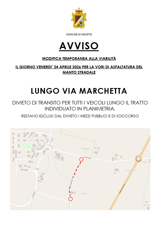 Modifica temporanea alla viabilità lungo via Marchetta il giorno venerdì 24 aprile 2026 per lavori di asfaltatura del manto stradale. Divieto di transito per tutti i veicoli lungo il tratto individua...