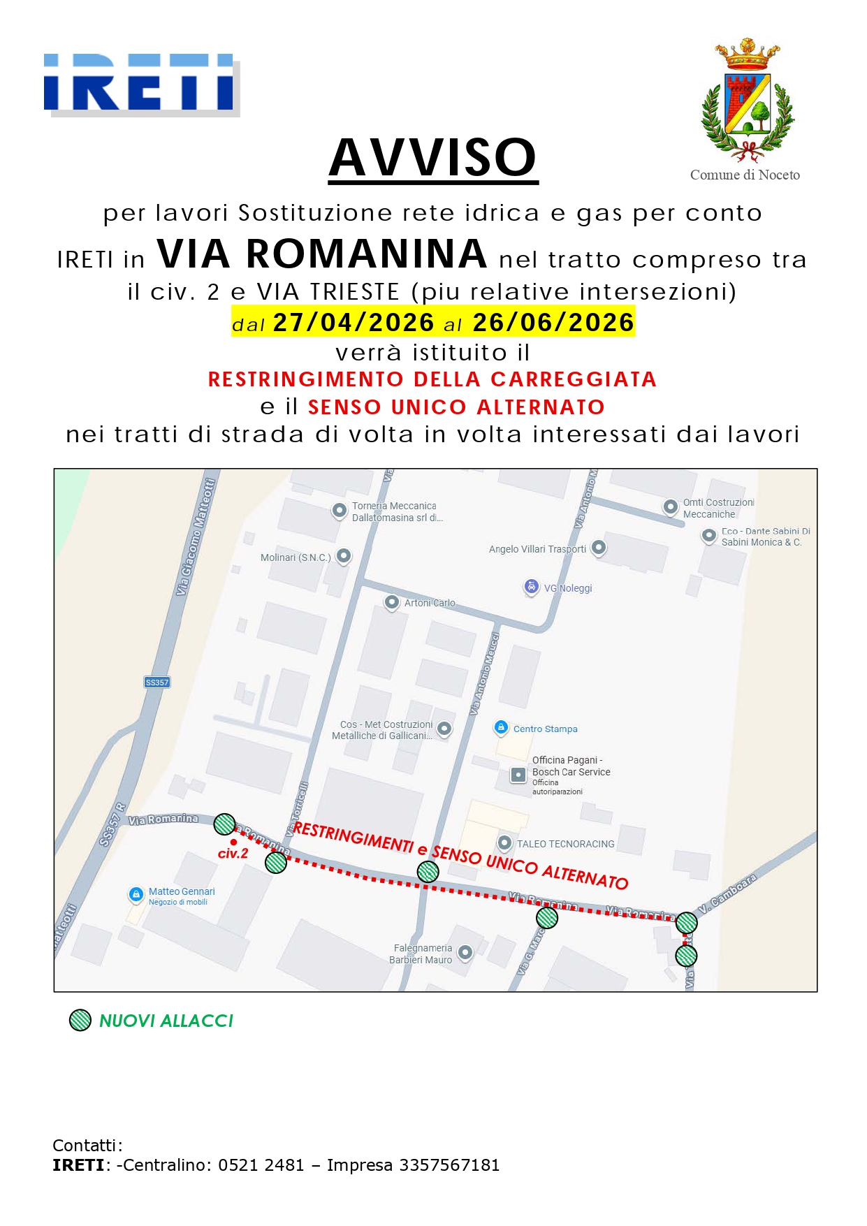 Per lavori di sostituzione rete idrica e gas per conto Ireti in via Romanina nel tratto compreso tra il civ. 2 e via Trieste (e relative intersezioni) modifica temporanea della viabilità dal 27/04/202...